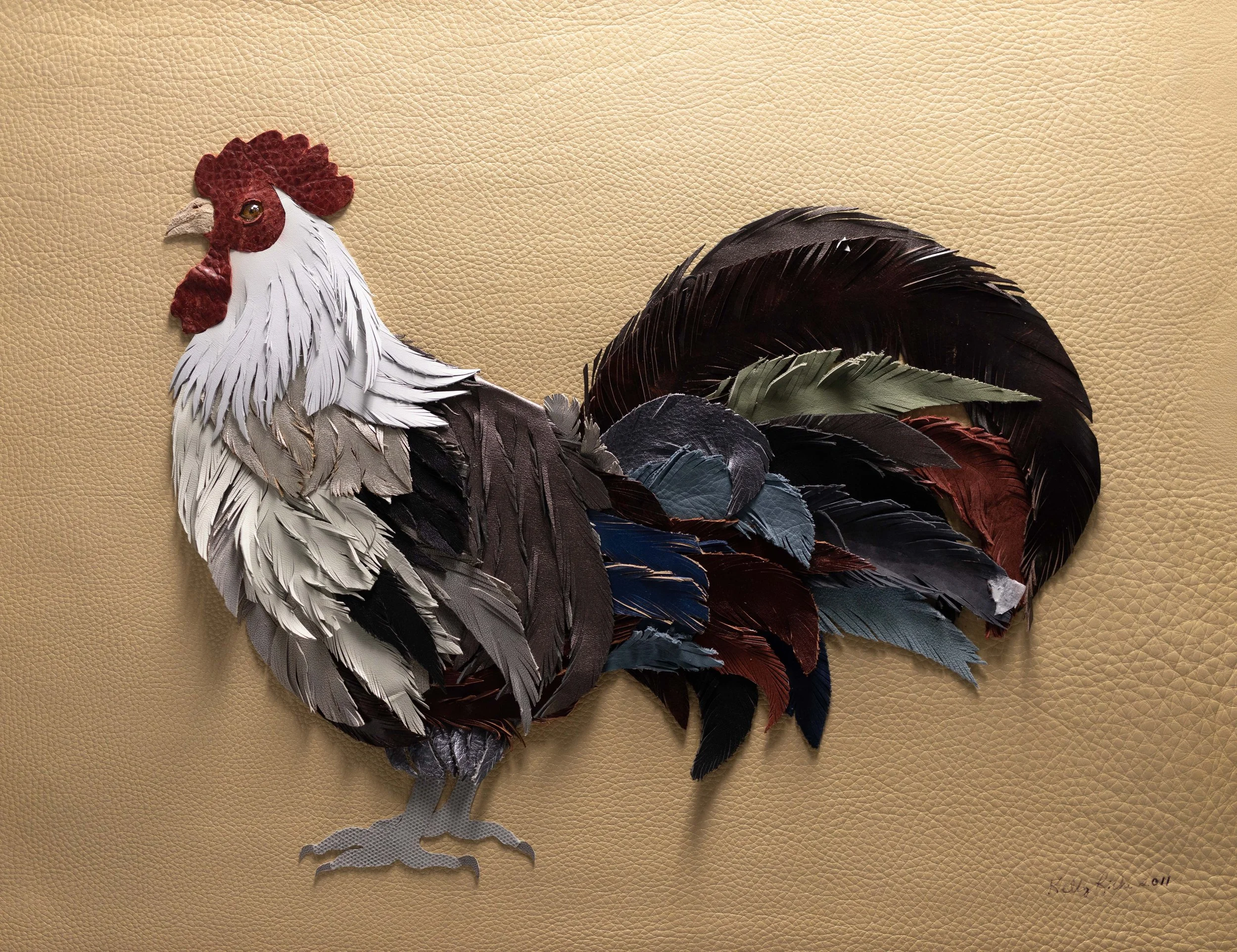 2011 | Herald is made with Fleathers and glue. Oops, Leather and glue. There is both cowhide leather and sheepskin leather on this colorful bird.
